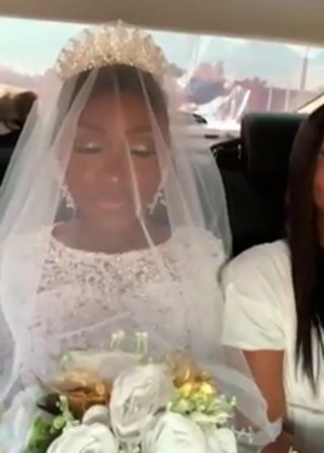 A woman in a wedding dress with a tiara and veil sits in a car holding a bouquet of flowers. Another woman sits beside her. The first woman appears to be emotional.