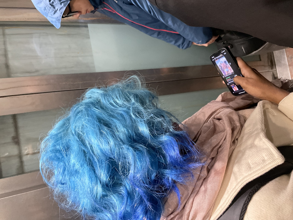 The scene takes place within an indoor or semi-enclosed public space in Montigny-le-Bretonneux, France. Two individuals are present. In the foreground, viewed from behind and slightly to the left, is a person with prominent wavy, bright blue hair, transitioning to a darker blue shade at the ends. This individual wears a light-colored top, possibly cream, partially covered by a light pink or beige scarf wrapped around the neck and shoulders. A dark strap, likely from a bag, is visible over the left shoulder. The person's right hand, exhibiting a medium to dark skin tone, holds a black smartphone horizontally, with the thumb interacting with the screen, which displays multiple media thumbnails, including a vivid, colorful image. To the right and slightly behind the foreground subject, a second individual stands, partially visible. This person wears a blue hooded jacket with a red zipper or trim and dark-rimmed glasses. Their head is covered by the jacket's hood, and their gaze is directed forward or to the right, away from the foreground individual. The background features a vertical structure composed of metallic frames and glass panels, some appearing reflective and others frosted or opaque, consistent with an elevator interior, a large glass door, or a similar architectural element. The immediate environment suggests a modern, utilitarian setting. No direct interaction is occurring between the two individuals.