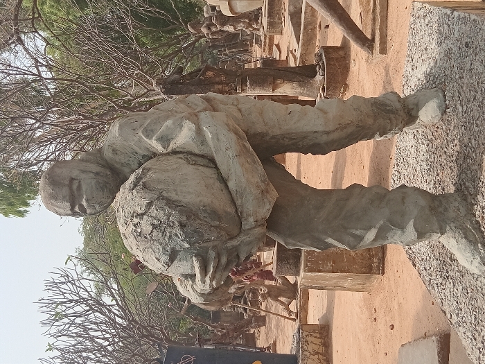 The image depicts an outdoor sculpture garden in Jama A, Nigeria
