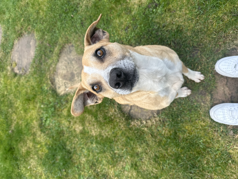 - "A light tan and white dog is depicted sitting on stepping stones within a grassy area in Limours, France" by FM-4J30F3, licensed under CC BY 4.0