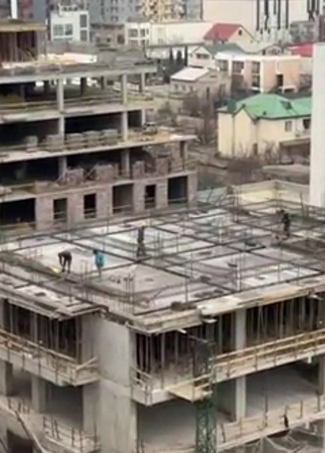 The video presents a mid-range, eye-level shot of a construction site in an urban setting. Multiple high-rise buildings are in the background, creating a dense cityscape. The focus is on an unfinished building under construction in the foreground, where several construction workers can be seen on its top level. They are working on the rebar framework, which is set in place above concrete pillars and the wooden forms for the next level’s pour. A construction crane stands alongside the building. The scene is overcast.