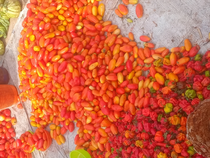This image, taken in Kawo, Nigeria, depicts an outdoor market display of fresh produce. The foreground and midground are dominated by a large, sprawling pile of elongated tomatoes, varying in color from bright red to orange and yellow. To the lower left, a distinct, smaller mound of multi-colored Scotch bonnet peppers, exhibiting red, orange, green, and yellow hues, rests adjacent to the tomatoes. All produce is arranged directly on a light-colored ground covering, likely a tarp or mat. In the upper left corner, two small orange plastic bowls contain additional portions of tomatoes. An orange plastic basket is partially visible in the upper mid-left, and a dark brown, possibly earthenware, bowl is partially visible in the lower left corner. In the upper right quadrant, some green leafy vegetables are partially visible. No individuals or specific actions are discernible within the frame.