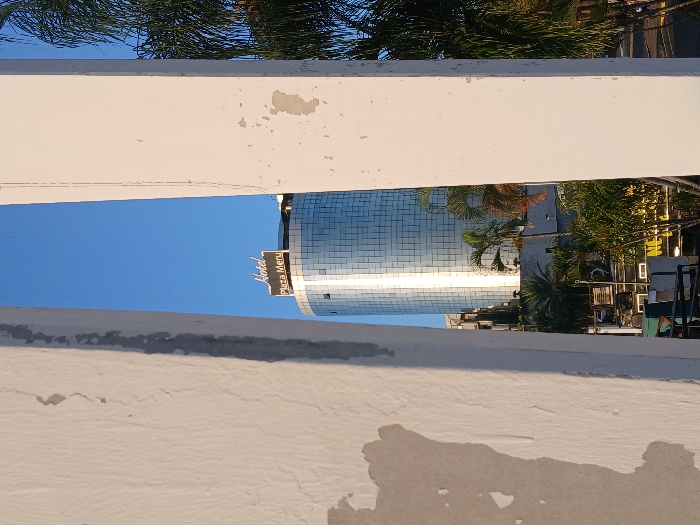 A low-angle shot captures a modern, curved building with reflective glass, identified by a sign as "Hotel Plaza Meru." The structure is partially obscured by two textured, off-white concrete surfaces in the foreground, one above and one below. Palm trees and blue sky are visible in the background. The image appears to be taken from a higher vantage point, looking down at the hotel between the concrete barriers.