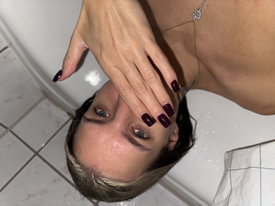 The image presents a close-up of a person, appearing female, positioned within a white bathtub in a tiled bathroom. The scene is situated in Berlin, Germany, though no specific street or building within the city is identifiable from the visible elements. The individual's head is tilted, revealing wet, dark hair with prominent blonde highlights. Blue-green eyes are directed towards the camera. The forehead exhibits some redness. The person's left hand, wet and featuring dark plum nail polish (short, square nails, with a longer, pointed thumb nail), covers the lower portion of the face, obscuring the mouth and chin. Water droplets adhere to the skin of the hand, shoulder, and upper chest. A thin silver-colored necklace with a key-shaped pendant, detailed with small clear stones, is worn around the neck. A faint tattoo is visible on the left upper chest/shoulder area. The immediate background consists of white ceramic tiles with light grout lines on a bathroom wall, and a curved white surface forming the interior of the bathtub. Reflections of an overhead light source are visible on wet surfaces.