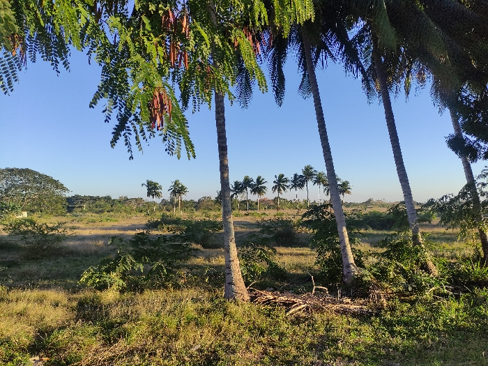The image captures a tranquil landscape under a clear, pale blue sky. Tall palm trees with slender trunks dominate the foreground, their leafy fronds partially framing the scene. A sprawling grassy field dotted with low-lying vegetation stretches towards the horizon. A row of smaller palm trees is visible in the distance. A large, leafy tree stands to the left, adding depth to the composition. The overall impression is one of serene natural beauty.