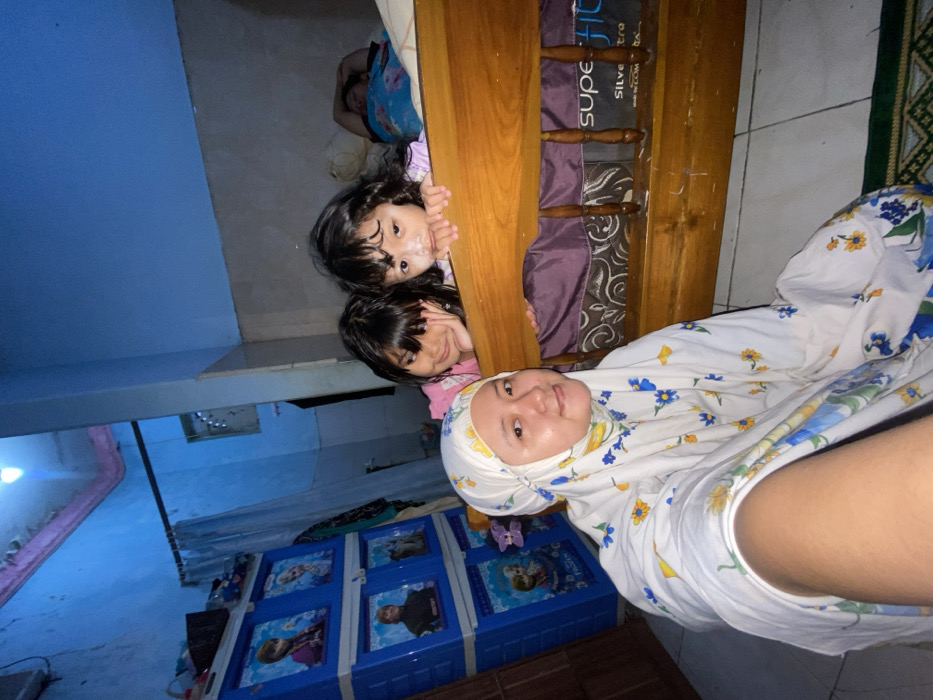 An indoor scene depicts a modest domestic setting in Gelam, Indonesia. In the foreground, an adult female is seated or kneeling on a green, geometrically patterned prayer mat, facing the camera and smiling slightly. She is wearing a white prayer garment (mukena) with blue and yellow floral patterns and a matching headscarf. Her right arm and shoulder are visible in the lower left, indicating she is holding the camera. Behind her, two young children are peering over a light brown wooden bed frame. The child on the left has dark hair with bangs, wears a pink top, and rests her chin on her hand, smiling towards the camera. The child on the right has dark, curly hair and a noticeable white powdery substance on her face, particularly around her nose and mouth. She looks directly at the camera with a neutral expression. Both children are wearing light-colored tops. Further in the background on the bed, a fourth individual is lying down, partially obscured by a blue patterned blanket, appearing to be asleep or resting. Only the top of their head and a shoulder are visible. The room features light blue painted walls, with visible wear and tear. A multi-tiered blue plastic storage cabinet adorned with "Frozen" character decals stands against the left wall. A light-colored curtain is visible further back on the left, and a window or opening is present on the back wall, also painted blue. The floor is covered with light-colored tiles. Artificial lighting, possibly from an overhead source, casts a bluish hue over the scene. The bed has a purple patterned mattress base.