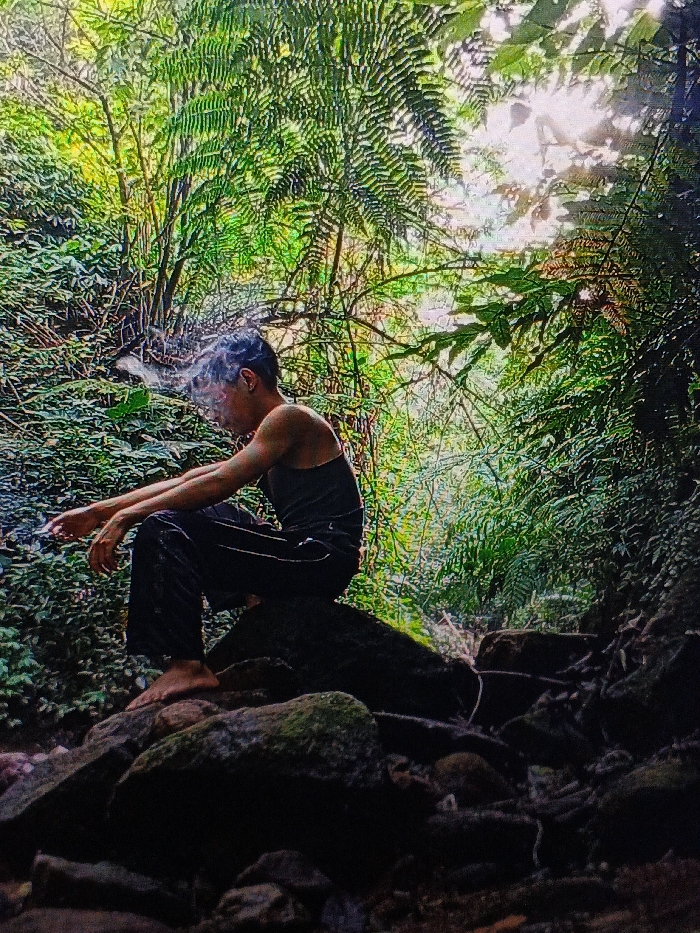 In the city of Taungpi, Myanmar (Burma), a single individual, appearing male, is depicted in a dense, natural, and heavily vegetated environment. The subject is shown in profile, positioned on the lower left of the frame, seated or squatting on a large, dark rock. He wears a dark tank top and dark trousers with a white stripe along the outer seam and is barefoot. His left hand holds a lit cigarette, from which a plume of white smoke is seen rising around his head. The immediate ground is composed of numerous dark, moss-covered rocks. The background and upper portions of the scene are dominated by lush, green tropical foliage, including large fern-like plants and various trees, suggesting a forest or jungle setting. Natural light illuminates the scene, with a brighter area visible in the upper right, likely indicating the sun's position.