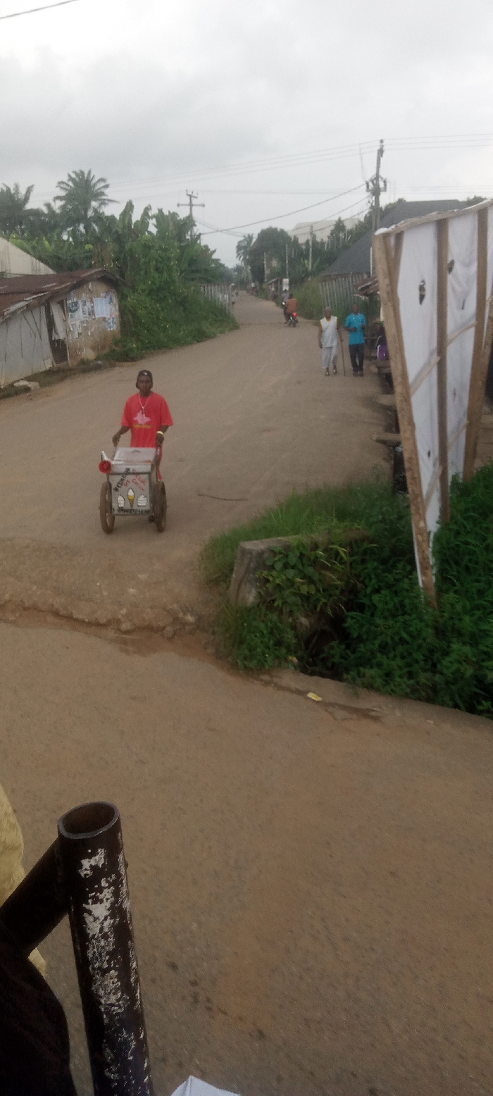 This image depicts an overcast daytime scene on an unpaved road in Ezinifite, Nigeria