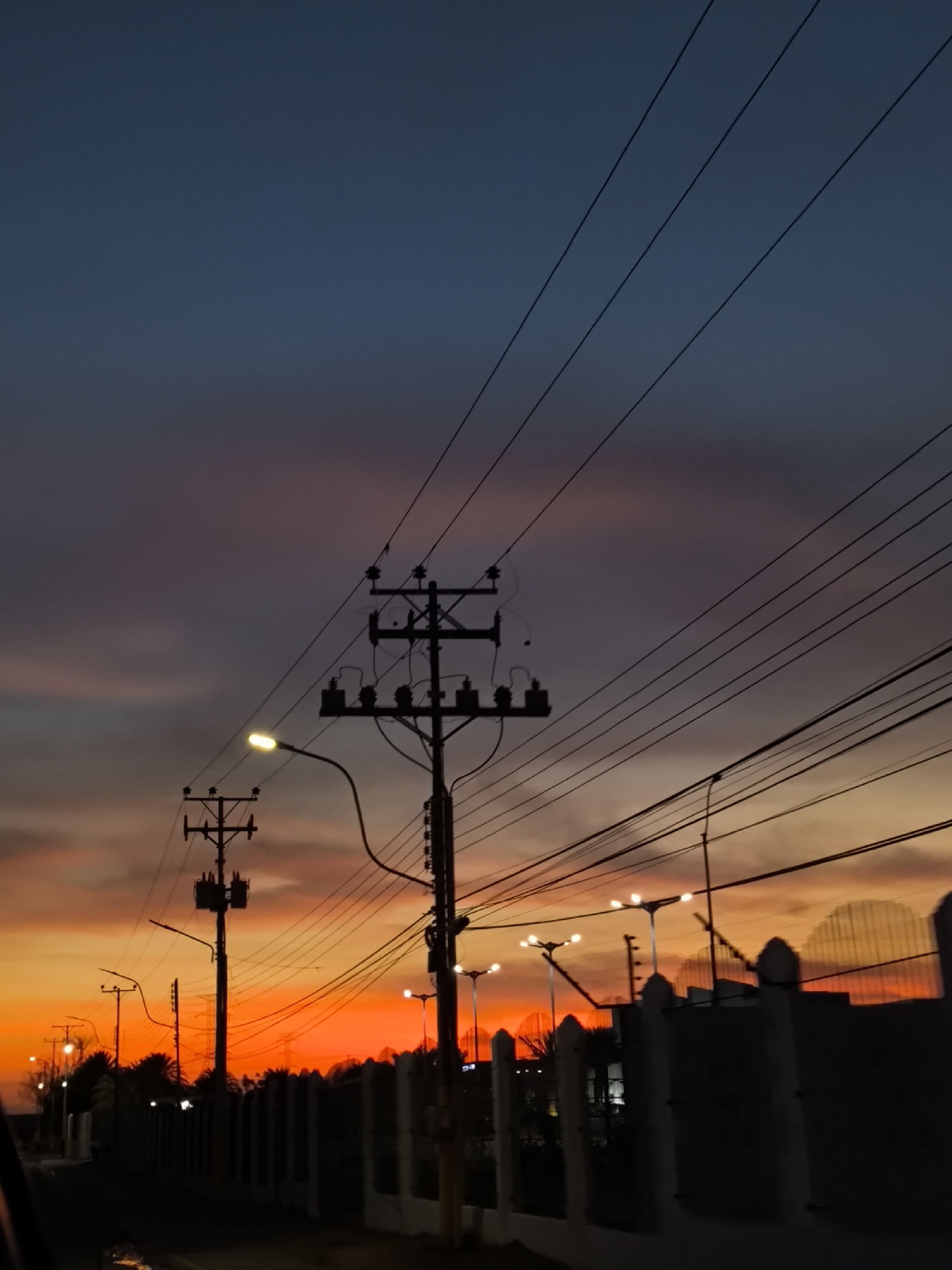 The photograph captures a street scene at dusk in what appears to be the city of Las Barrancas, Venezuela, as suggested in the prompt. The sky transitions from a deep blue at the top to shades of orange and pink closer to the horizon. Prominently featured are utility poles and overhead power lines, silhouetted against the colorful sky. Street lights are visible, some illuminated and others not. A low fence lines the side of the road. Vegetation, possibly trees or bushes, can be seen behind the fence. The scene is largely dark, with light emanating from the setting sun and artificial street lights.