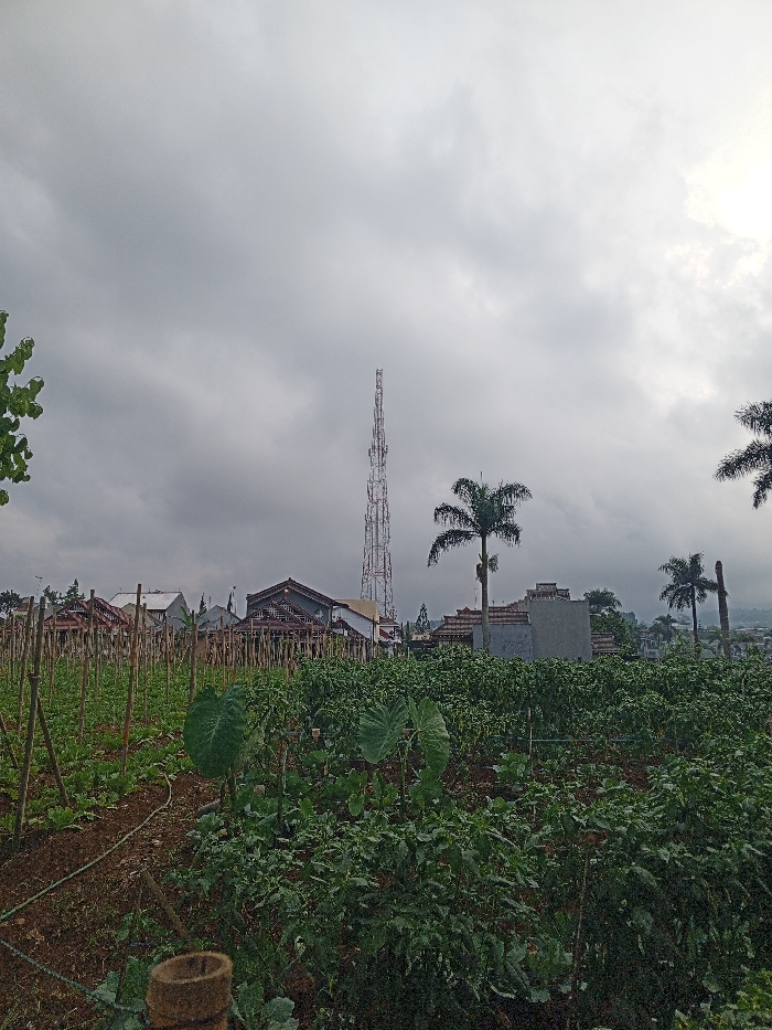 The image depicts a semi-urban agricultural landscape in Batheay, Cambodia, under a heavily overcast sky. In the immediate foreground, a cultivated field is visible, featuring rows of green crops, some supported by vertical wooden stakes, and interspersed with larger broad-leafed plants like taro. Dark brown soil is exposed, with a black irrigation hose traversing the ground and a brown cylindrical object (possibly a wooden post) in the bottom center. Further into the midground, dense green vegetation, likely additional crops, extends across the frame. The background is characterized by a prominent red and white lattice telecommunications tower. Surrounding the tower are residential buildings with various roof styles, including some structures that appear to be under construction or renovation with visible wooden frameworks. Multiple palm trees are scattered throughout the background, standing above the buildings. The sky is uniformly grey with dense cloud cover. No individuals or specific actions are discernible within the scene.