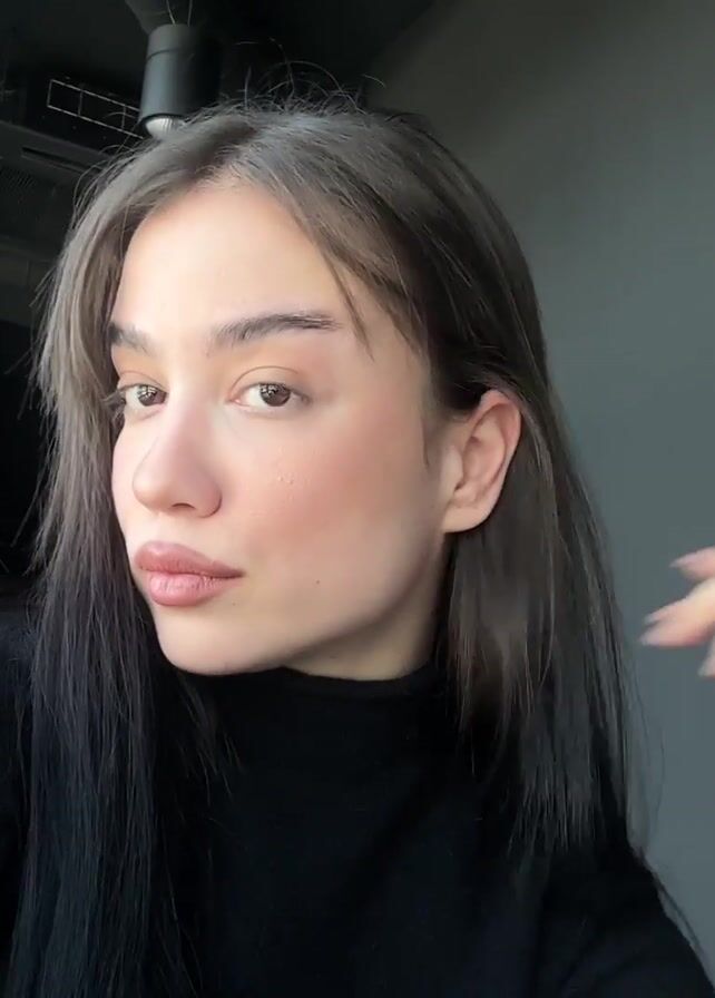 A young woman with long dark hair and light skin poses for the camera indoors. She is wearing a black top. She touches her hair and purses her lips. The background is a gray wall with a glimpse of a ceiling fixture.