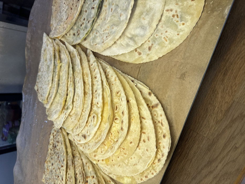 - "The image displays numerous freshly prepared flatbreads, arranged in three distinct stacks on a large sheet of light brown parchment paper" by FM-pcSm62, licensed under CC BY 4.0