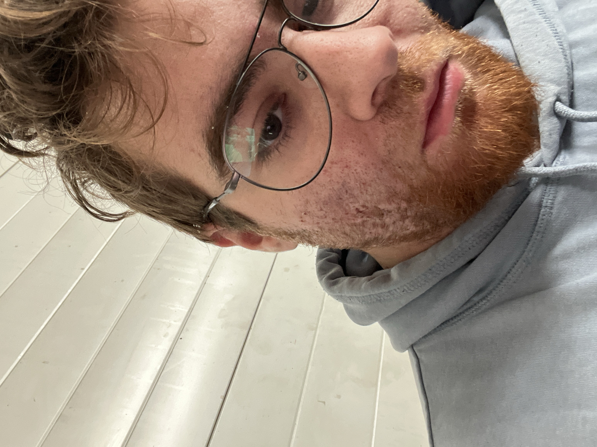 A close-up, tilted selfie of a man with brown hair and a red beard wearing round eyeglasses and a grey hoodie. The background shows white, horizontal slats. The location is not discernible from the image.