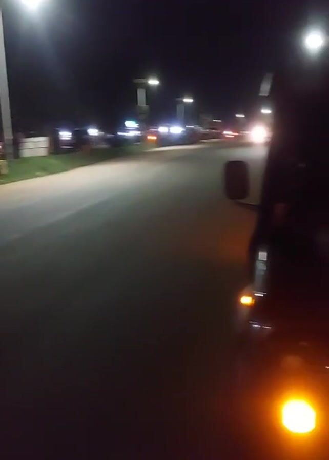dark street at night, illuminated by street lights. In the distance, there are parked vehicles and some activity visible. The camera is focused on a dark SUV, which is parked on the side of the road. A person is standing near the vehicle. The SUV's parking lights are on, adding a bit of illumination to the immediate surroundings. The overall atmosphere is dim and quiet.