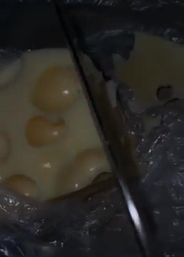 A block of cheese with prominent holes rests on a crinkled plastic surface