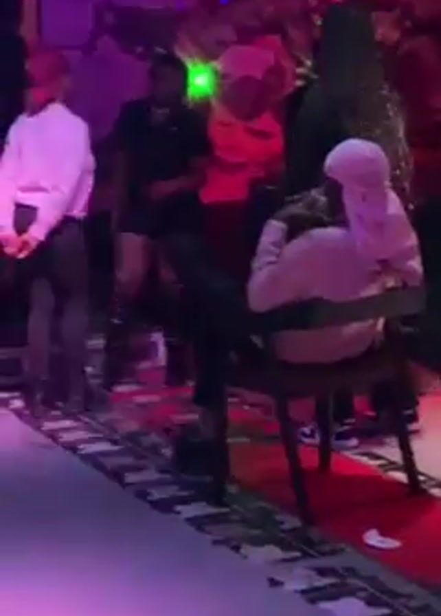 dimly lit, indoor gathering space with club-like lighting. Several individuals are present, standing or moving around, while one person is seated in a chair facing away from the camera. The room features a red rug, tables with bottles and glasses, and decorative lighting on the ceiling. The overall environment suggests a relaxed or social setting, possibly a club or a private party.