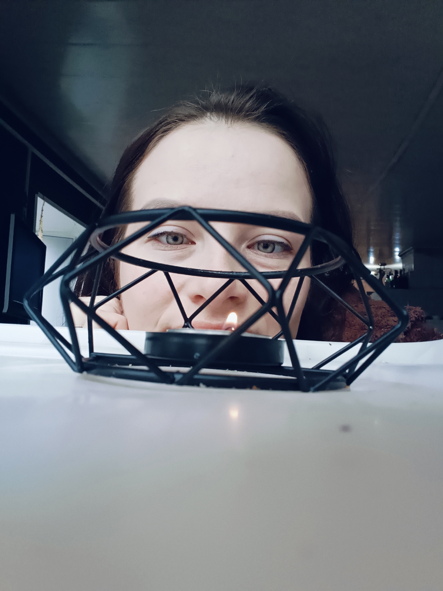 A woman with brown hair and light eyes peers from behind a geometric black metal candle holder containing a lit tealight candle. The scene is indoors, with a light-colored, flat surface in the foreground. The background includes a dark area above and a glimpse of a room with white walls and dark furniture to the left. There are no apparent indicators of the city of Rusalevka, Russia, in the image.