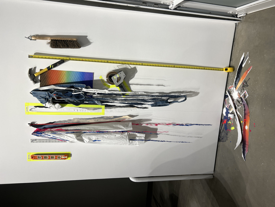 A collection of various objects attached to a white wall: a brush, a yellow measuring tape, a hammer, a rainbow-colored pad, a tape dispenser, shredded denim, some white material, a ruler, and a level. Some of the items are illuminated in fluorescent yellow. Debris of some kind is scattered in the lower right corner on the floor, including some blades of sorts.