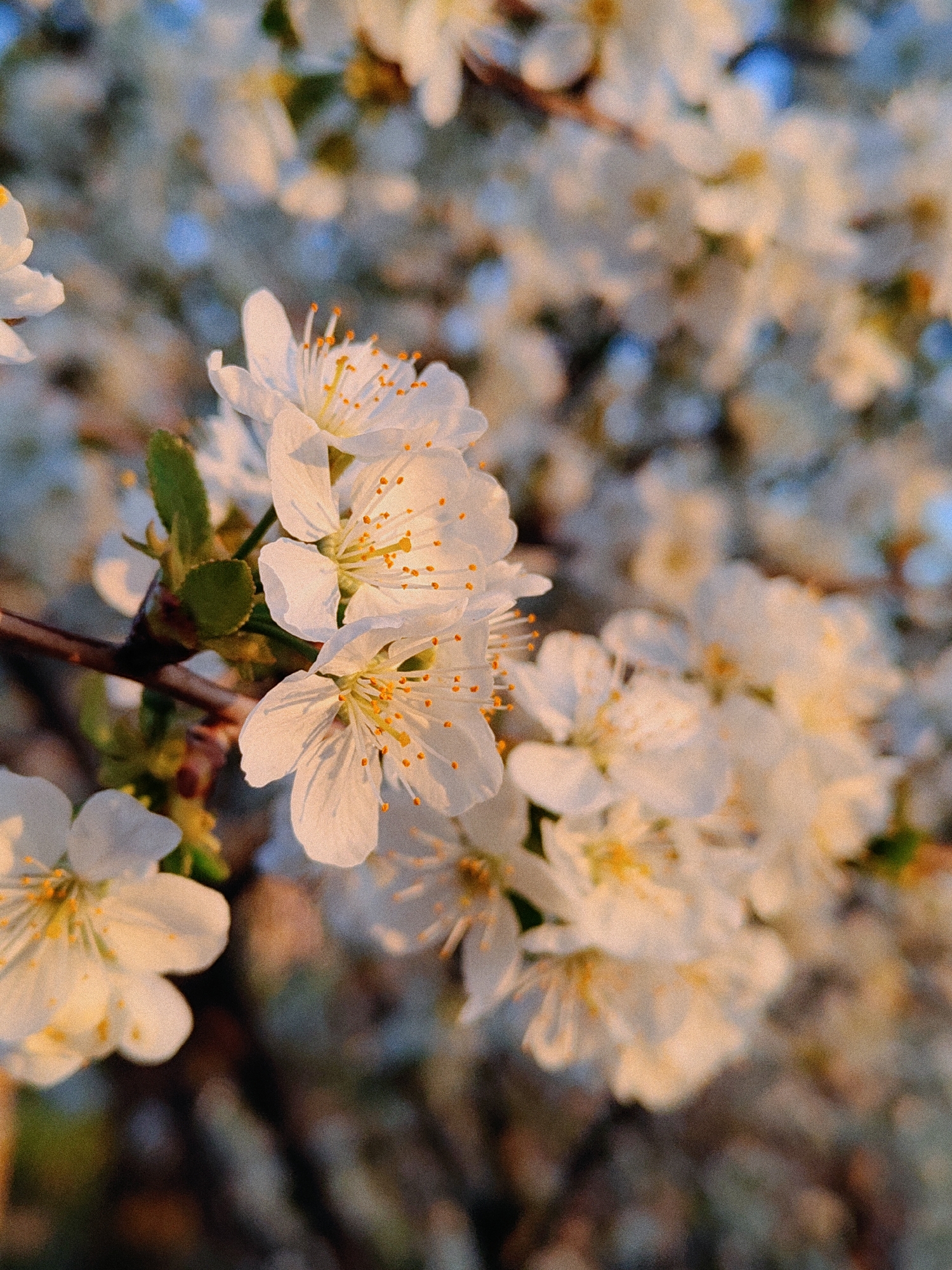close-up of white blossoms on a tree branch. The flowers have five petals and yellow-orange stamens. Some green leaves are visible among the blossoms. The background is a blur of more white blossoms and some blue sky peeking through. The lighting is warm, suggesting the golden hour. The location is Blagovo, Bulgaria, based on the prompt instructions. There are no people depicted.