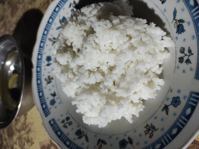 A white ceramic plate with a blue and floral design sits on a table with a brown and beige patterned tablecloth. A mound of white cooked rice fills the center of the plate. The rice is moist and fluffy. The scene appears to be a simple meal or a portion of a meal, likely prepared in a home or a small restaurant. The location is Kecamatan Buduran, Indonesia at the coordinates -7.432 latitude and 112.722 longitude.