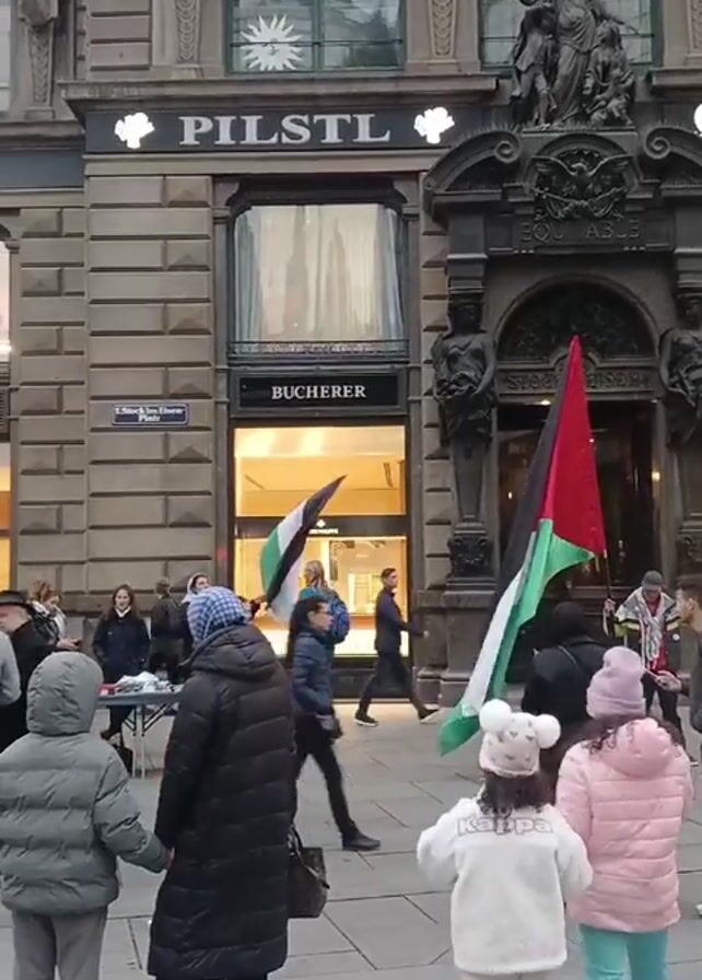 A group of people stand in a plaza or pedestrian area in front of a building with “PILSTL” and “BUCHERER” signs. Some people are holding Palestinian flags. People walk around the plaza, some sit on benches. The buildings appear to be in an older European style. It is daytime.
