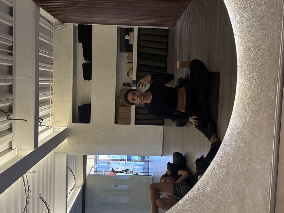 A mirror selfie of a person in black athletic wear, holding a phone. A second person sits on the floor in the mirror's reflection. The room is a fitness studio with minimalist decor. Stacks of mats and yoga blocks line the walls. The floor is light-colored wood. The building's ceiling and structure are visible, painted white with industrial-style beams. Natural light enters through a window.