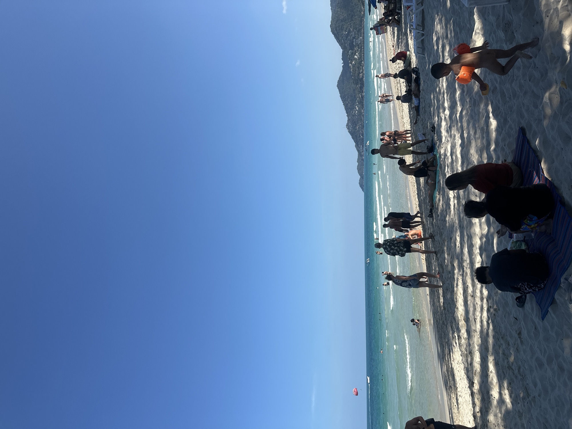 This image depicts a beach scene in Baan Chaweng, Thailand. The sky is clear blue. People are on the beach and in the water. Some are sunbathing, others are walking or swimming. A child with orange arm floaties runs on the beach. There are mountains in the background. A parasail is visible in the distance.