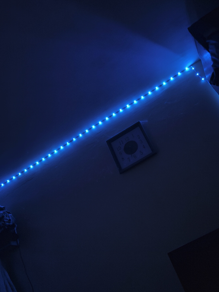 The scene depicts an interior room located in Slavyanovo, Bulgaria, illuminated primarily by artificial blue light. A string of numerous individual blue LED lights is affixed to the upper portion of a dark wall, extending from the lower left towards the upper right corner, forming a distinct horizontal line that defines the boundary of the ceiling or upper wall. Below and to the right of the center of the image, a square-framed wall clock is mounted on the dark wall. The clock features a light-colored face with dark numerical hour markers (1 through 12) arranged circularly, and a dark central disc where clock hands would typically be. The hands are not discernibly visible. In the lower-left corner, an indistinct dark mass, possibly folded textiles or clothing, is partially visible. The upper right corner shows a dark, bulky object, consistent with a piece of furniture or a structural element of the room. The overall environment is dimly lit by the blue LEDs. No individuals are present.