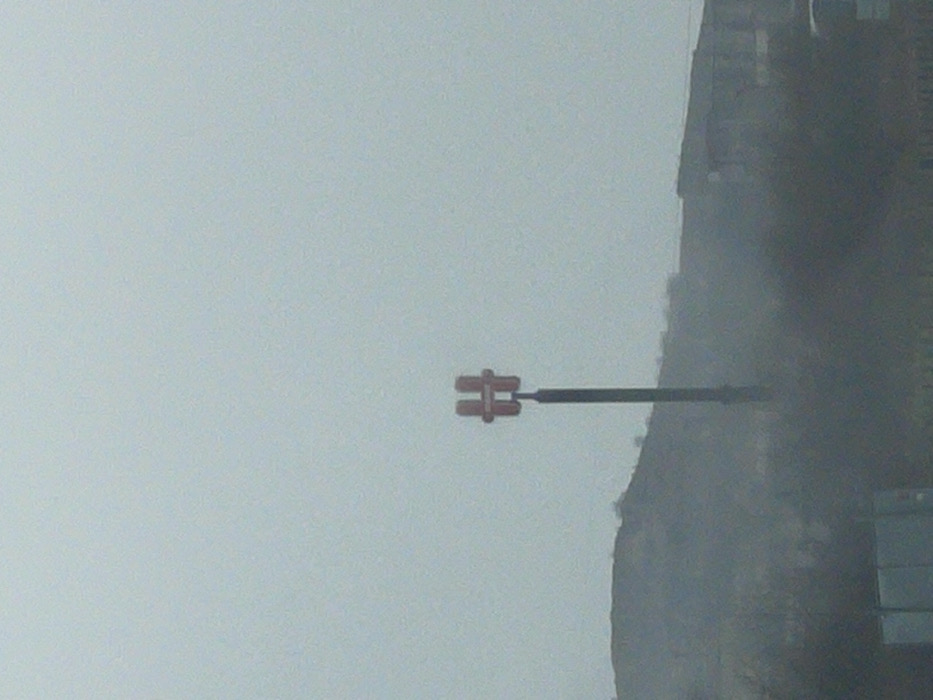 The scene depicts an outdoor landscape in Polsko Padarevo, Bulgaria, under an overcast or hazy sky. A tall, dark-colored pole, topped with a distinctive red, H-shaped structure, stands prominently in the mid-ground. In the background, a large, dark hill or mountain range rises to the left, partially obscured by atmospheric conditions. To the right of the hill, a series of indistinct dark structures, consistent with buildings, are visible along the distant horizon. The immediate foreground consists of blurred, dark ground cover. A partial view of a light-colored rectangular object is visible on the lower left, and the upper portion of a light-colored vehicle is present on the lower right. No individuals are visible. The lighting is uniformly diffused, indicating an overcast day.