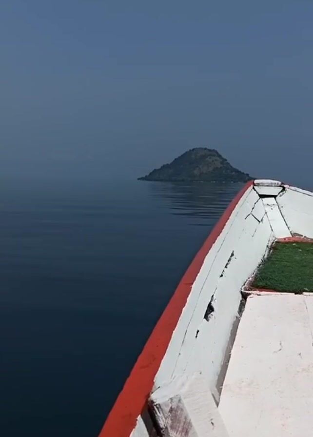 The view from a boat moving on a calm body of water reveals a tranquil scene under a clear sky. The boat's edge is visible, featuring a white surface with a red trim. The water is dark and placid, reflecting the light with subtle ripples. In the distance, several small, green islands dot the horizon. The scene is serene and appears to be shot on a sunny day.