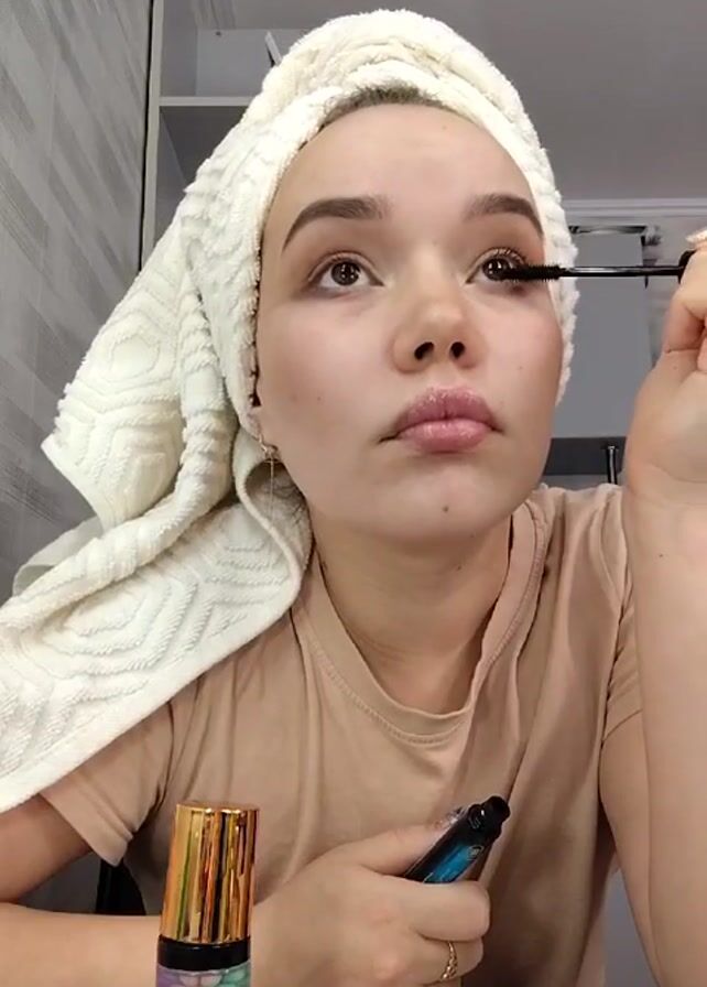A young woman with fair skin is applying mascara to her upper lashes. She is wearing a light brown t-shirt and a white towel is wrapped around her head, covering her hair. She has earrings in, and her lips appear to have some sort of lip gloss on them. She is seated in front of a table on which various makeup items are scattered, including a bottle with a gold lid and iridescent scales, a mascara tube, and several makeup brushes. The background includes white paneled walls and a shelf containing a small plant. The video seems to be shot indoors, possibly in a bathroom or dressing area. Upbeat music is playing in the background.