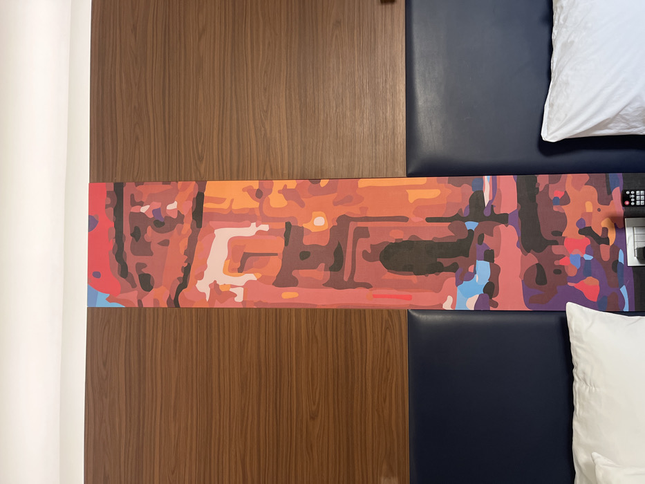 A wall design features a horizontal, stylized artwork with shades of orange, brown, blue, and purple, positioned between a dark wood panel on the left and a navy blue cushioned wall on the right. Two white pillows rest against the blue wall, with a remote control and other electronic devices sitting on a dark surface attached to the blue panel. A narrow white wall is on the left.