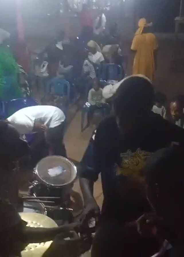 The video captures a lively outdoor gathering at night. A crowd of people are visible in the background, seated on chairs and milling about. In the foreground, a group of musicians appears to be playing drums. One man, wearing a black t-shirt with a yellow design, is prominent as he interacts with the drum set. There is a sense of community and celebration in the air. The lighting is dim, creating a somewhat foggy or hazy ambiance.