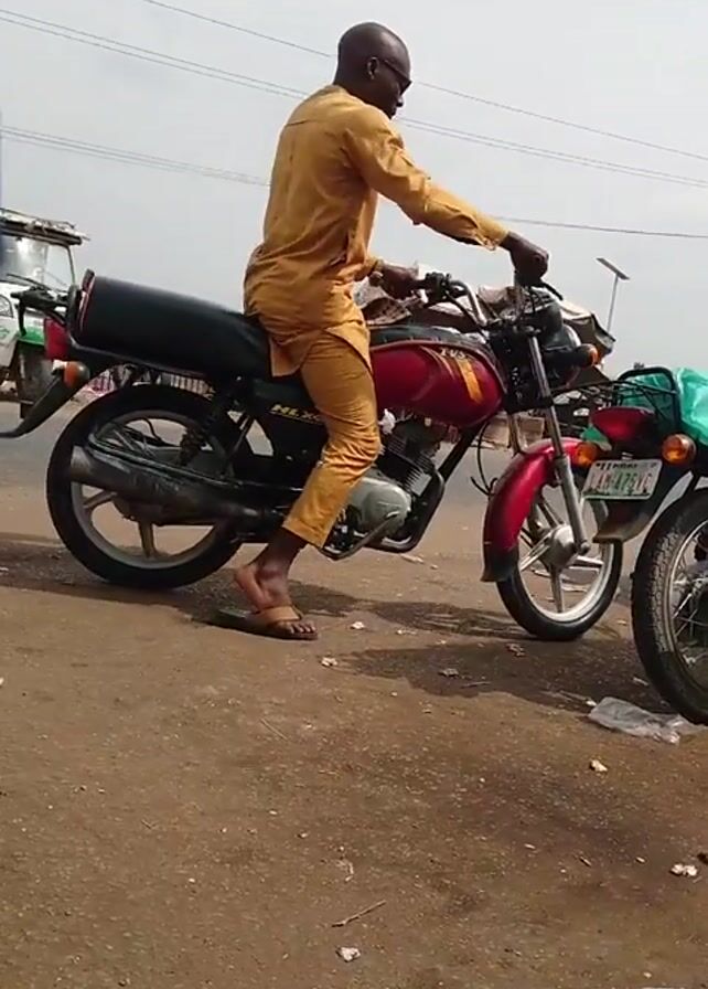 A man in a tan outfit sits on a red and black motorcycle parked on a weathered, dirty street. He is wearing sandals. Other motorcycles are parked nearby. There is litter scattered on the ground. Another man walks by the parked motorcycles. The sky is overcast and power lines are visible overhead.