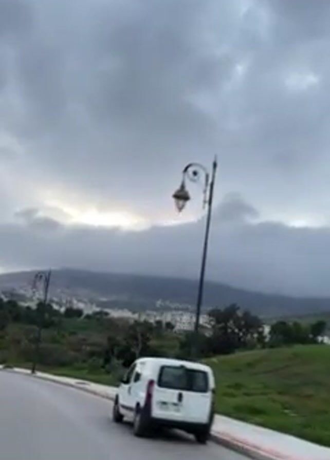 cloudy day on a road overlooking a city. A white van is parked on the side of the road. A decorative street lamp is visible. The city is nestled in the foothills of a mountain, which is partially obscured by the clouds. The sun is trying to break through the clouds.