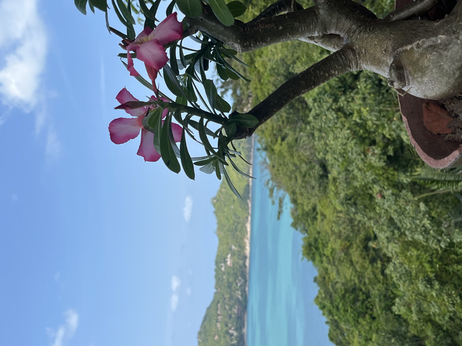 A vibrant pink and white flower blooms on a succulent-like plant with green leaves. Behind the plant, a stunning view unfolds: a bright blue sky with scattered clouds transitions into turquoise water bordering a lush green, hilly coastline. A cracked terracotta pot is visible on the right side. The scene is vibrant and captures a serene tropical landscape.