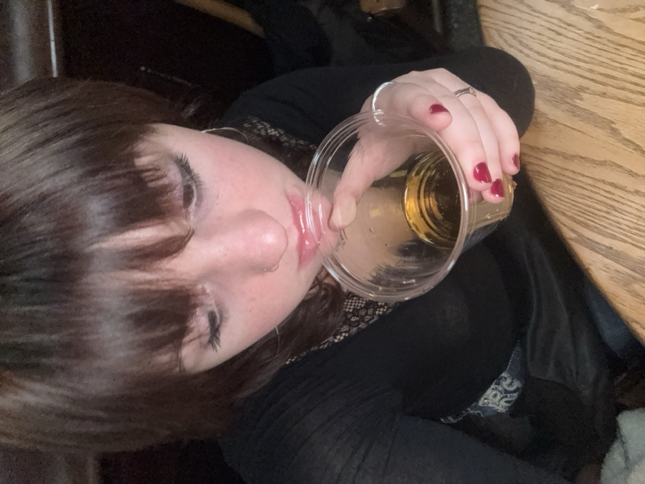 - "A woman with bangs holds a plastic cup of amber liquid to her lips" by FM-IdNfF2, licensed under CC BY 4.0