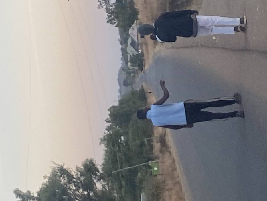 Two people walk on a paved road. One person wears a light-colored shirt and dark pants. They raise their arm in a gesture. The second person wears a dark jacket and light pants. Trees and a hazy sky are visible in the background. Power lines stretch across the sky.
