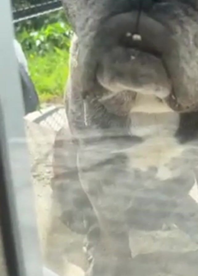 A medium shot captures a brindle French Bulldog, its face pressed against a glass window from the outside, looking into the camera. The dog has noticeable drool hanging from its mouth. Outside, green foliage is visible in the background. The perspective is from inside a structure, as evidenced by the window frame on the left side of the frame. The dog is standing on a concrete surface.