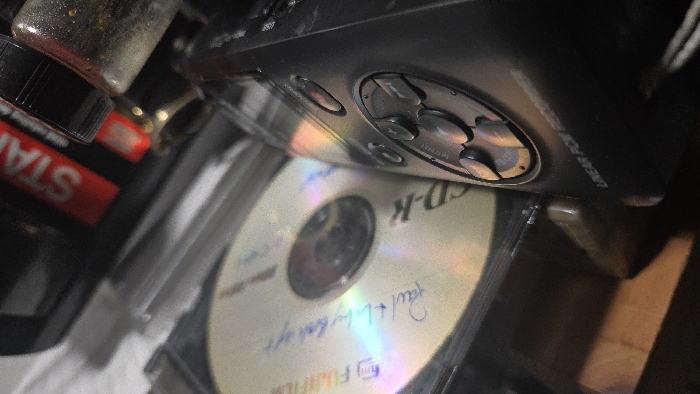 An angled, close-up indoor photograph taken in Lompoc, United States, displays an arrangement of electronic components and containers on a surface. A Fujifilm CD-K compact disc is prominently featured in the upper center, partially within a clear plastic case. The disc surface bears handwritten blue ink text, legible as "Paul + Lily backup." In the foreground, a dark gray portable electronic device, identified by "LINEAR PCM" text along its left edge, exhibits a control panel with multiple circular buttons, including a central directional pad and a "MENU" button. To the lower right, a transparent container with a black screw-top cap is visible, containing a dark, granular substance. Behind this container, a red label is partially visible, displaying the letters "STA." The background consists of indistinct dark and wooden surfaces. The scene is dimly lit, producing iridescent reflections across the compact disc and the electronic device. No individuals or dynamic actions are depicted.