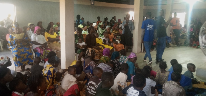 The image displays a large indoor gathering of approximately 70-100 individuals, primarily women and children, situated within a spacious, unadorned room in Kafanchan A, Nigeria