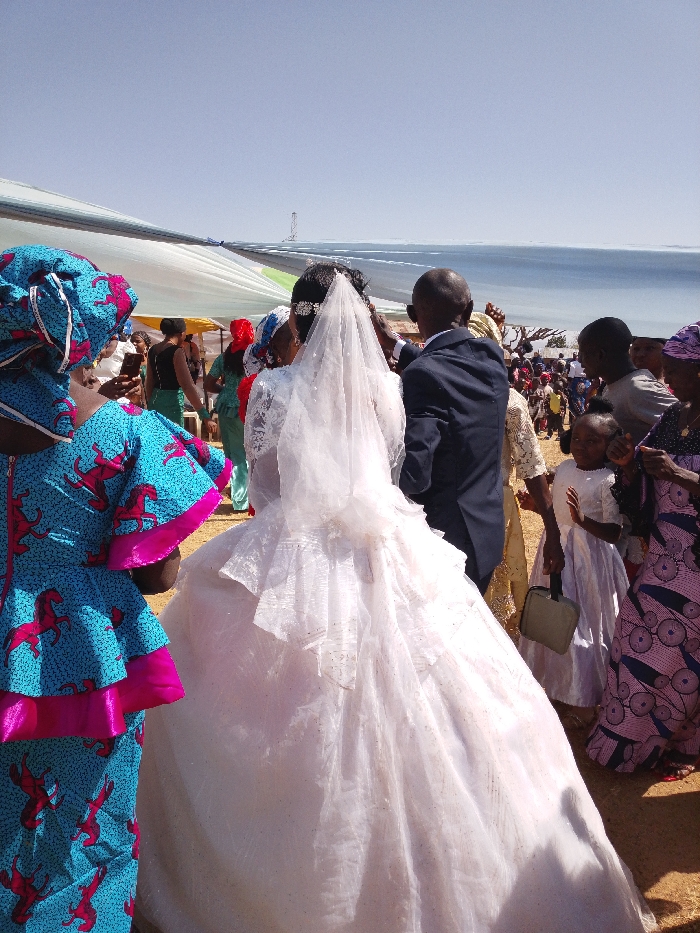 An outdoor wedding scene is depicted in Angwan Sarki, Nigeria, under a clear, bright sky