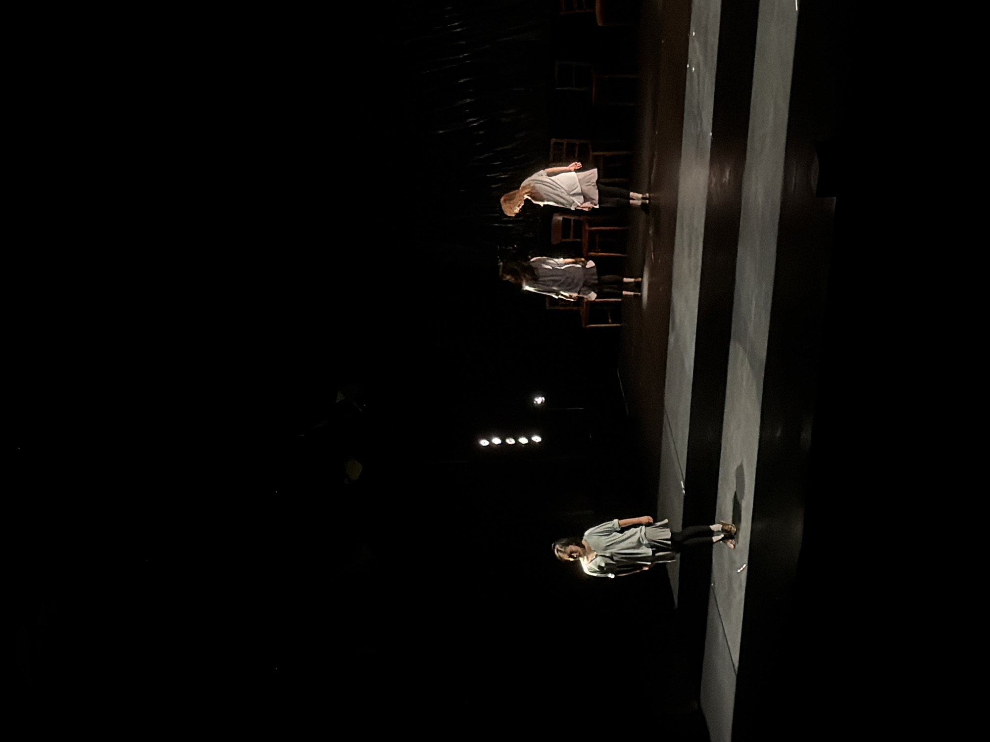 scene on a stage, possibly a theatrical performance. Three individuals are present on the stage. Two of them are positioned near a set of chairs, and the third one is standing closer to the front edge of the stage. The stage itself is marked with distinct stripes, and lighting fixtures are visible above. The location is the Théâtre Romain Rolland, Villejuif, France.
