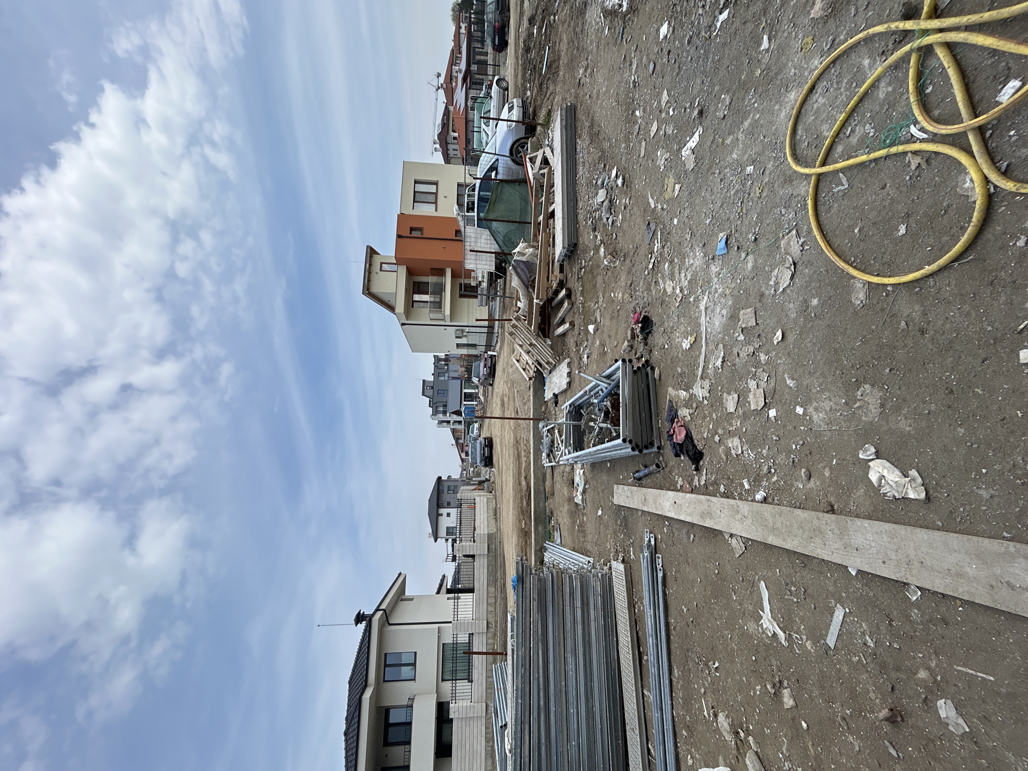 The image depicts a construction or residential development zone in Plovdiv, Bulgaria, under an overcast sky with scattered white clouds. The foreground consists of unpaved, disturbed earth littered with construction debris including small paper fragments, plastic, and various discarded materials. A long wooden plank lies centrally on the ground. To the left, a substantial stack of galvanized metal scaffolding frames and tubes is neatly piled. To the right of the plank, disassembled scaffolding components and dark fabric are scattered. In the lower right corner, a coiled yellow hose is visible. In the mid-ground, a pile of wooden pallets and timber fragments rests on the dirt. Behind this, a light-colored utility truck is parked next to a silver minivan or station wagon, which is partially covered by a green tarp. Several other vehicles are parked further down an unpaved road. The background features multiple two-story, modern residential houses. On the left, a white house with a dark tiled roof and black-framed windows is prominent, fronted by a low concrete wall topped with a black metal fence. A lightning rod extends from its roof. Another similar house is partially visible behind it. On the right, a distinctive house with white and orange facade sections and an angular roofline stands. Further in the distance, more houses with red-tiled roofs are visible, and the boom of a construction crane can be faintly seen against the horizon. No individuals are present in the scene.