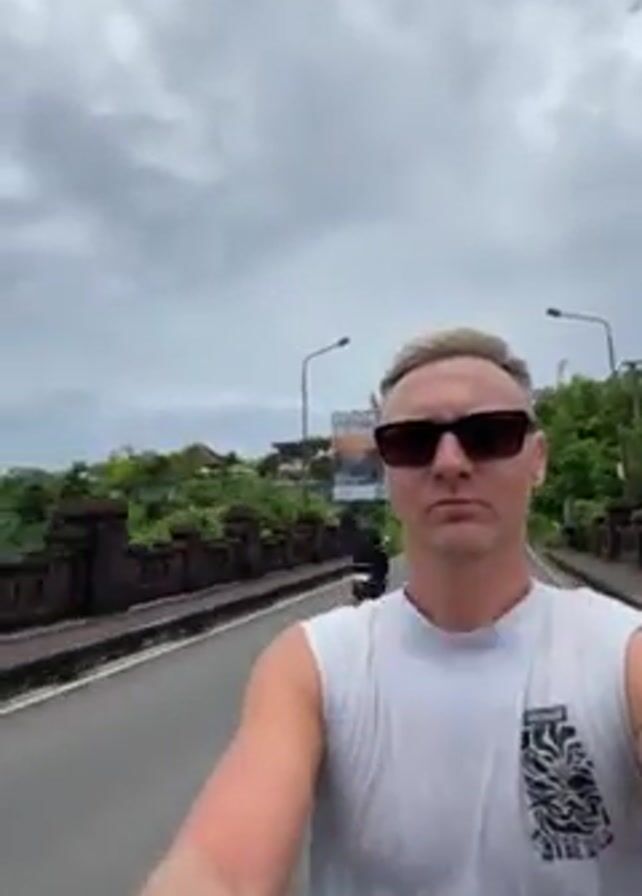 A man wearing sunglasses and a white tank top is riding a scooter across a bridge. The bridge has stone rails and light posts on either side. There are trees and buildings visible beyond the rails. The sky is overcast. The man waves at the camera.