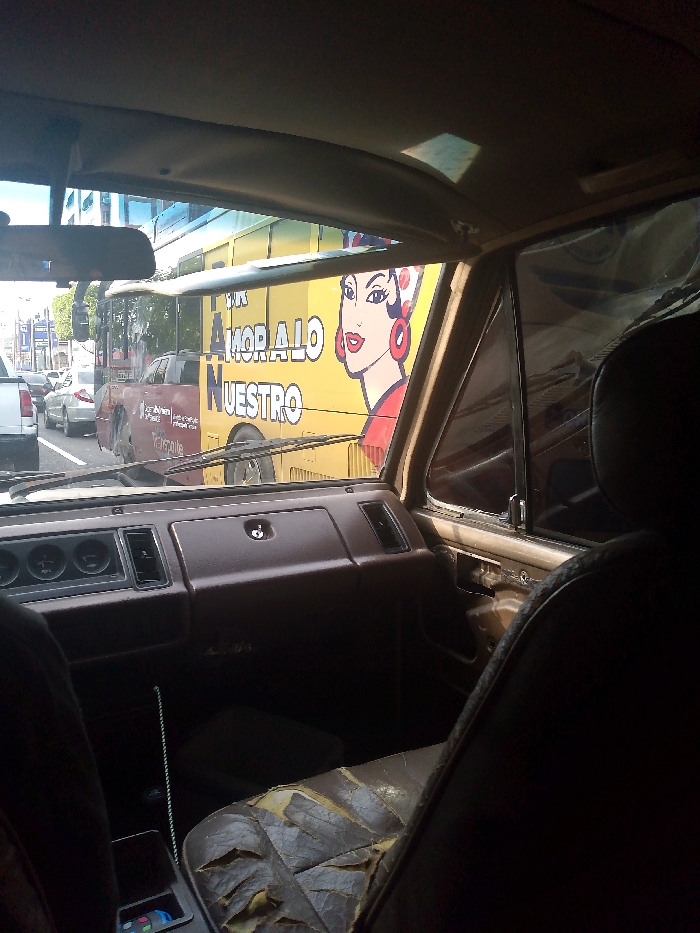 The image depicts a street scene viewed from the interior of a vehicle in Maracaibo, Venezuela. The perspective is through the front windshield, looking out onto a busy urban thoroughfare. In the foreground, the interior of the viewer's vehicle is visible. The dashboard, dark brown in color, features four circular gauges on the left side and an air vent on the right. Windshield wipers rest horizontally on the lower portion of the windshield. A rearview mirror is attached to the ceiling above the dashboard. The front passenger seat, upholstered in dark brown material, shows extensive wear, characterized by numerous tears and cracks. In the midground, immediately adjacent to the viewer's vehicle, a large yellow public transport bus is prominent. The bus displays a significant graphic of a stylized woman's face with dark hair, a red head covering, and large red hoop earrings. White capital letters next to the graphic spell out "AMOR A LO NUESTRO" (Love for what is ours). Partially visible behind the bus is a red pickup truck. The background shows additional vehicles, including cars and trucks, in what appears to be a congested traffic lane. Buildings, some with reflective blue windows, and green trees are discernible further down the street under natural daylight conditions.