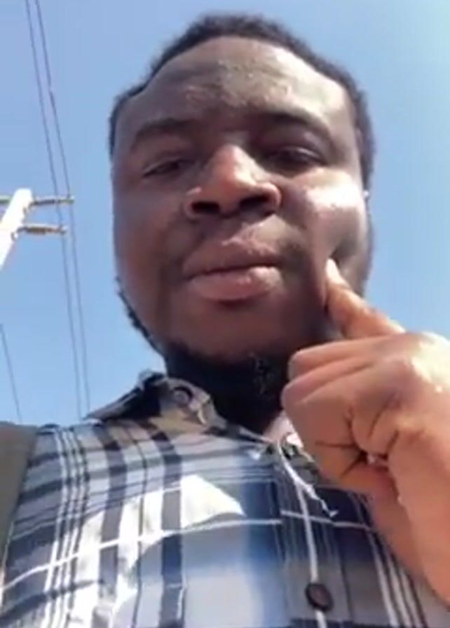 A man with dark skin is looking at the camera, which is recording from a low angle. The man is wearing a button-down plaid shirt with a combination of white, blue and grey. He has short, dark hair. He appears to be outdoors. Behind him are utility poles, a clear blue sky, and a billboard in the distance. He looks up and around, and then makes a face toward the camera.
