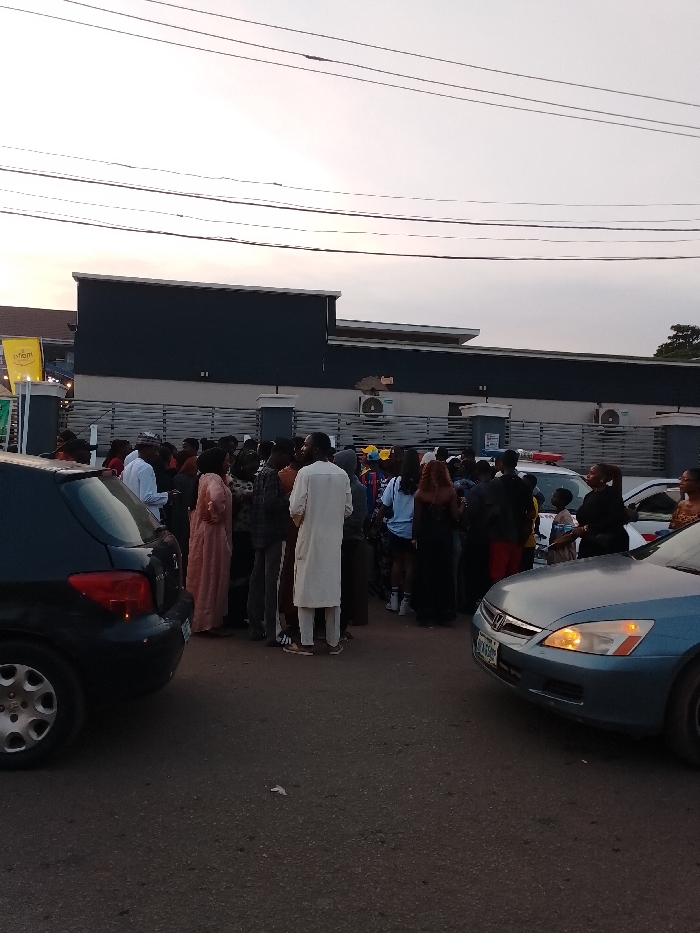 A large group of people are gathered on a street between a dark hatchback and a light blue sedan with its headlight on. Behind the crowd stands a modern building with a dark facade, featuring visible air conditioning units. A police car is parked among the other vehicles. Overhead, a network of utility lines stretches across the sky. The overall scene suggests an event or gathering causing traffic congestion.