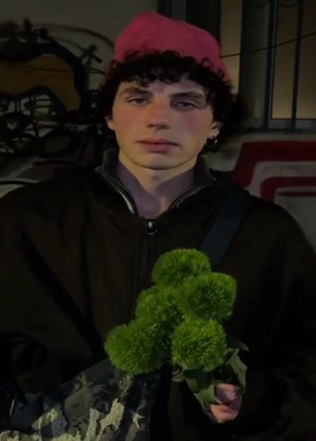 A young man with curly dark hair stands facing the camera. He wears a pink knit cap and a dark-colored hooded jacket with a gray undershirt. He has a shoulder bag and holds a bouquet of green pom-pom flowers. The background appears to be an urban setting with graffiti on a wall. The lighting suggests it is nighttime. The man looks directly at the camera with a slight smile.