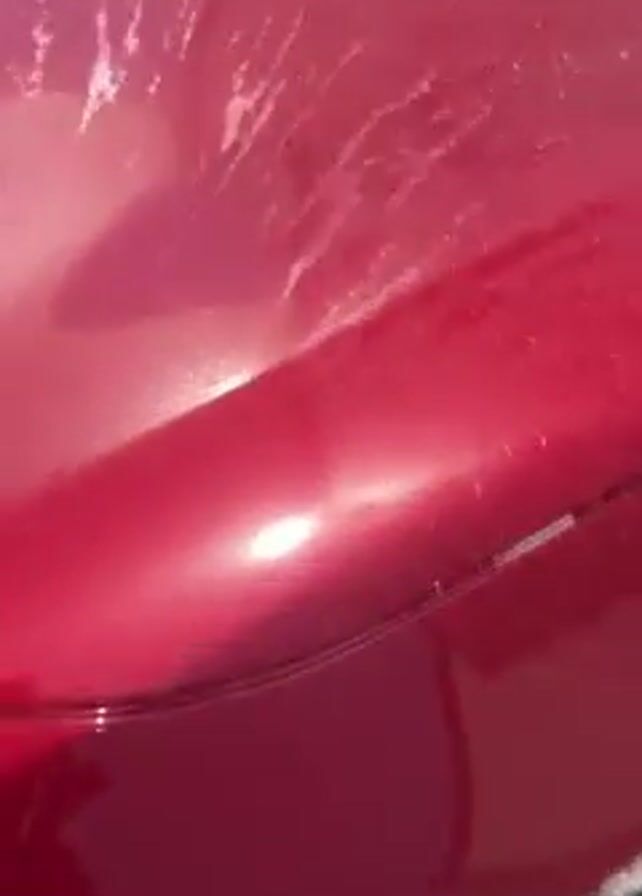 A red car is being dried off with a blower